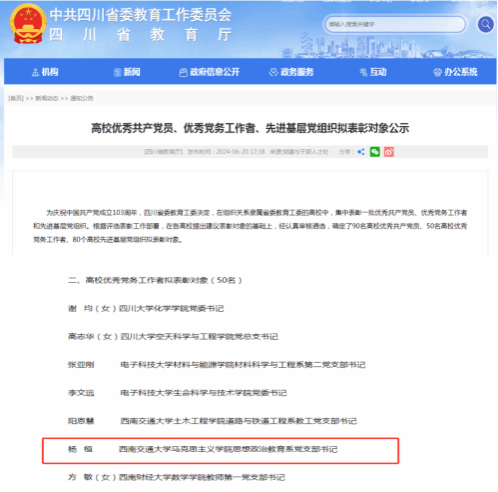 为庆祝中国共产党成立103周年,四川省委教育工委决定,在组织关系隶属省委教育工委的高校中,集中表彰一批优秀共产党员、优秀党务工作者和先进基层党组织。根据评选表彰工作部署,在各高校提出建议表彰对象的基础上,经认真审核遴选,确定了90名高校优秀共产党员、50名高校优秀党务工作者、80个高校先进基层党组织拟表彰对象。学院思想政治教育系支部书记杨桓同志荣获高校优秀党务工作者荣誉称号。
