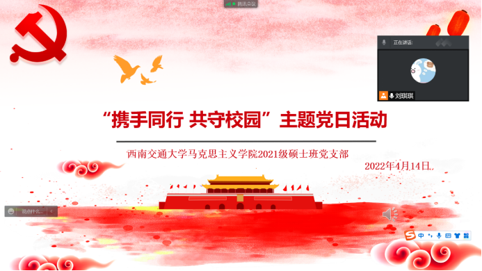 为进一步做好疫情防控工作,守护员工身体健康和生命安全。4月14日晚上8:30,2021级硕士班党支部在线上开展“携手同行 共守校园”主题党日活动。会议由纪检委员穆春凤同志主持,2021级硕士班党支部全体党员参加。