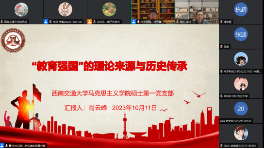 为深入学习贯彻习近平新时代中国特色社会主义思想和党的二十大精神,引导高校青年深刻领会和准确把握建设教育强国的本质属性和丰富内涵,强化建设教育强国的使命担当,bevictor伟德官网硕士第一党支部于10月11日晚19:30参加“赓续重教尚学优良传统,吹响教育强国建设号角”川内五所“双一流”高校联学联讲活动。