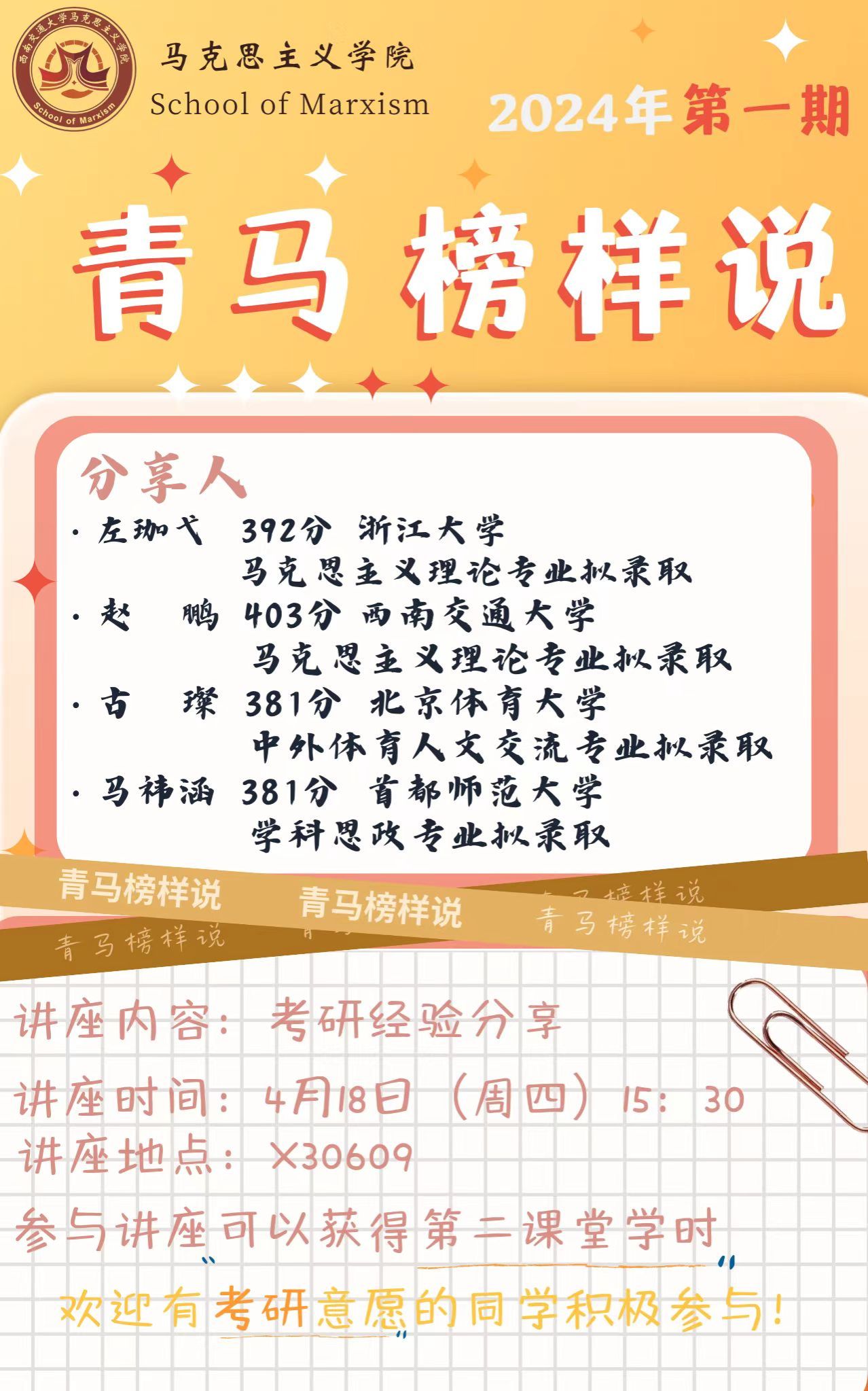 为了发挥朋辈教育作用,为意向考研的同学搭建交流学习的平台,让同学们明确考研的方向与目标,了解考研择校、备考等方面的注意事项,bevictor伟德官网将于4月18日15:30组织“青马榜样说”考研经验分享会。现将有关事宜通知如下: