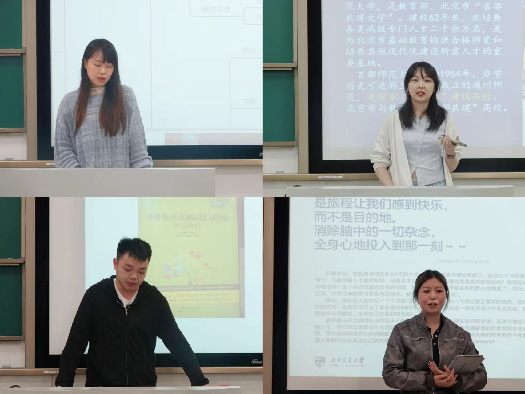 独行者步疾,结伴者行远。为了助力同学们更好地掌握复习方法,为意向考研的同学搭建交流学习的平台,积极发挥优秀学长学姐的榜样作用,汲取榜样力量,4月18日15:30bevictor伟德官网在X30609举办了2024年“青马榜样说:考研择校与复习经验分享”活动,本次活动邀请了在2024年考研中取得优异成绩的左珈弋、马祎涵、赵鹏、古璨四位同学作为分享嘉宾。学公司党委副书记邓秀芸,本科生辅导员杜晓林、赵子涵出席此次活动,大三同学共同参与。