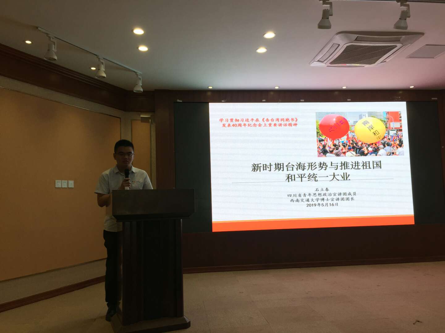 5月19日19:30-20:30,四川省青年思想政治宣讲团成员、校博士宣讲团团长,公司2015级博士研究生石立春,为参加四川大学半月谈“同心圆”的少数民族同学,开展以“感悟五四运动的爱国主义情怀”为题的政治宣讲。