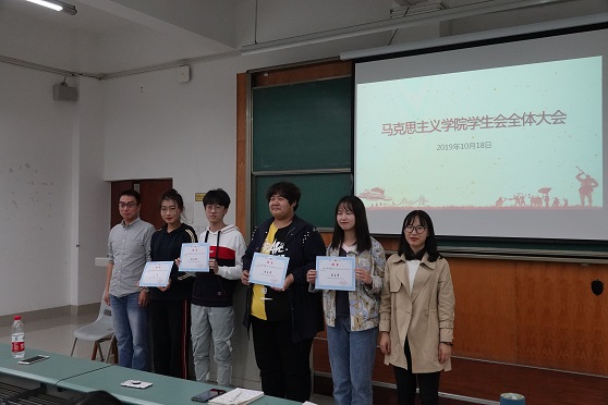 接着,会议的第二、三环节是由赵晨老师和杜晓林老师一起为本科生员工会主席团和各部门成员颁发聘书。