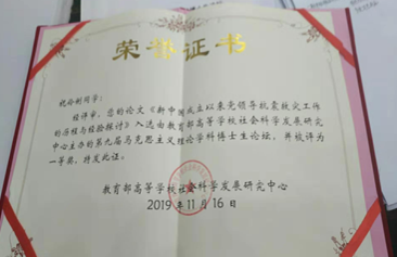11月16日至17日,由教育部社科中心与西南大学联合举办的“中国特色社会主义理论体系研究工作推进会暨第九届马克思主义理论学科博士生论坛”在重庆召开。来自全国近70所高校和科研机构的有关领导专家、中国特色社会主义理论体系研究专项项目在研课题负责人及22名博士生代表共120余人参加会议。公司2018级博士生祝伶俐同学的论文成功入选并获得一等奖。