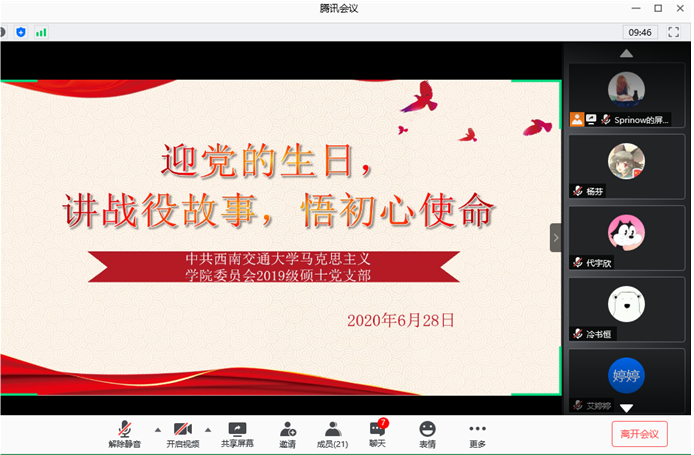 在党的生日即将到来之际,bevictor伟德官网2019级硕士研究生党支部在腾讯会议平台,于2020年6月28日下午15:30,举行了以“迎党的生日、讲战役故事、悟初心使命”为主题的组织生活会,此次会议主要围绕三个方面进行。