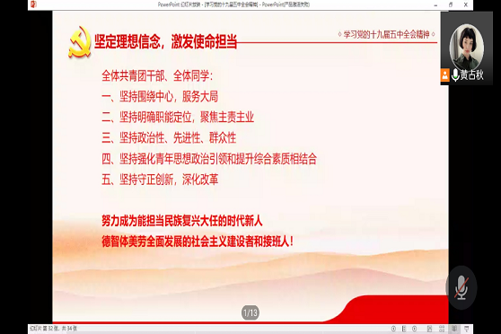 活动对党的十九届五中全会精神进行了系统、全面的解读,深入浅出、内容丰富,思政2018级全体团员都认真地学习、准确地把握全会精神。活动最后,黄占秋还呼吁全体团干部、全体同学:要坚持围绕中心,服务大局;坚持明确职能定位,聚焦主责主业;坚持政治性、先进性、群众性;坚持强化青年思想政治引领和提升综合素质相结合五、坚持守正创新,深化改革。努力成为能担当民族复兴大任的时代新人和德智体美劳全面发展的社会主义建设者和接班人!