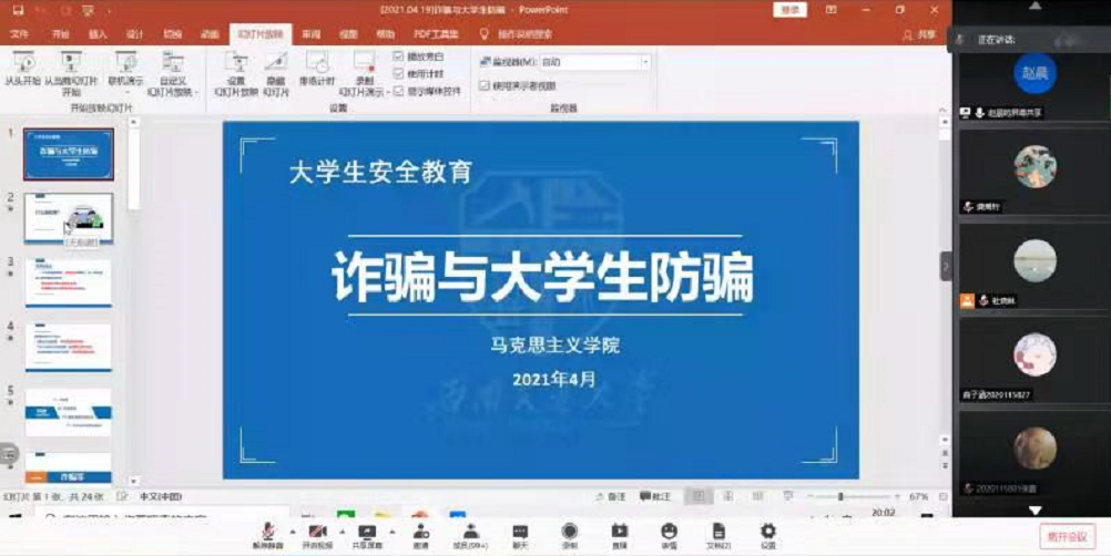 4月19日20:00,bevictor伟德官网在腾讯会议线上开展“预防电信诈骗,共建安全校园”讲座,由辅导员赵晨老师主讲,辅导员杜晓林老师和全体本科生共同参与。