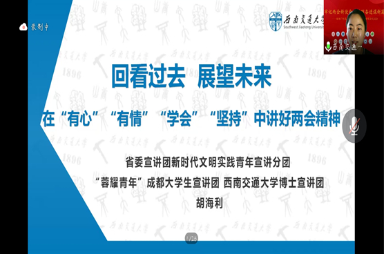 在研讨过程中,兰州大学、西北工业大学等17所高校的宣讲员围绕如何开展两会精神宣讲进行积极发言探讨。伟德国际唯一官网入口博士宣讲团的胡海利博士以“回看过去,展望未来”为题,提出在“有心”“有情”“学会”“坚持”中讲好两会精神。她用“坚持认真准备”“坚持虚心请教”“坚持完成任务”三个坚持来传达自己对于宣讲的坚持,对于宣讲的热爱。