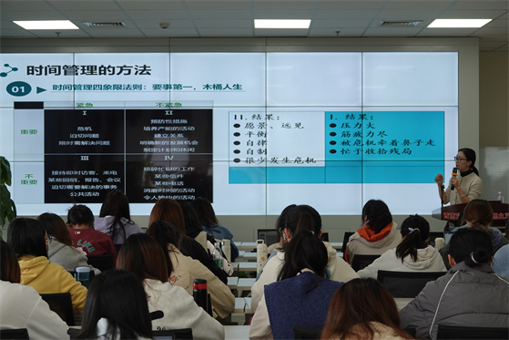 黄雪娇老师从自身经历引入,针对现阶段部分同学反映在学习和生活中忙忙碌碌却收获不大的普遍问题,和同学们共同探讨了怎么走出时间管理的焦虑以及如何做到有效的时间管理,引发了同学们对时间管理的深入思考。黄雪娇老师讲到,优秀的时间管理者具备以下共同特点:有清晰的自我角色定位;对代办事项有明确的实施方案;会管理自己,把主要时间和精力用在对自己重要的事项上;效率和专注度高;在学习、工作、家庭、自我身心健康等方面都能做到统筹兼顾。而要成为一名优秀的时间管理者,需要我们合理分配和运用时间,把时间真正用到“刀刃”上。
