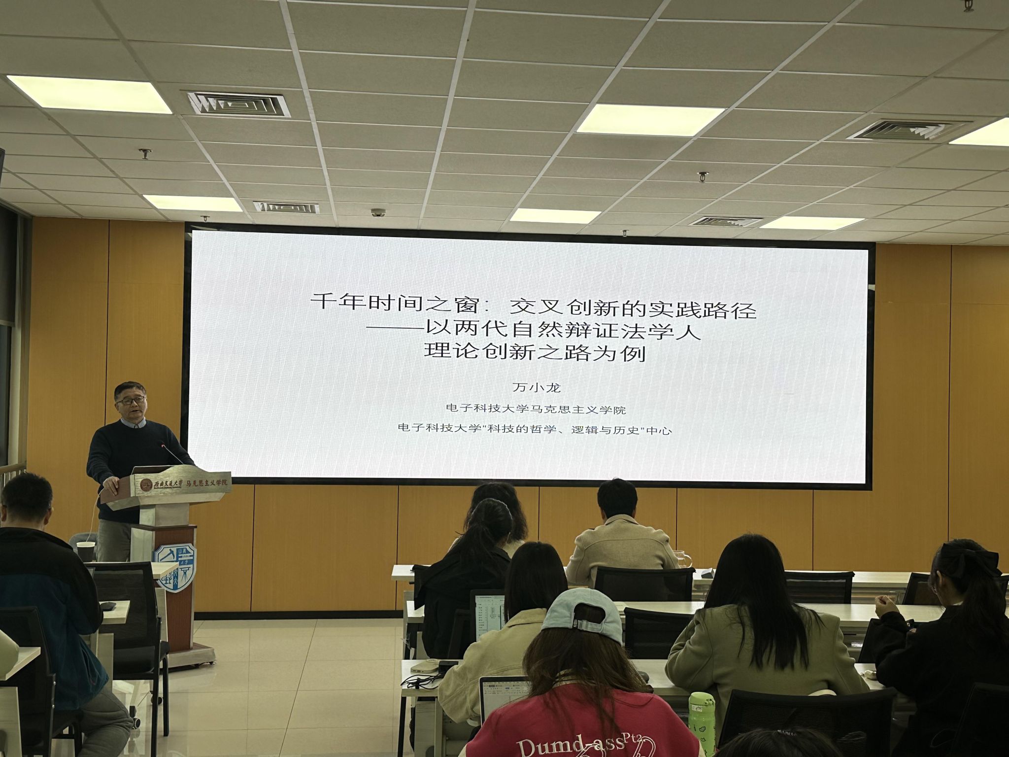 万小龙教授以“千年时间之窗:交叉创新的实践路径”为题,以自己从事科技哲学研究的缘起与历程引入,着重讲述了两代自然辩证法学人理论创新之路,强调当今是需要交叉创新的时代。万小龙教授认为,西方传统思辨、中国传统类比、近代科学分析三种思维的交融碰撞,是创新人才发展必不可少的。当代青年学子应当朝这个方向努力,加强进行基础理论攻关的决心和勇气。万小龙教授的整个演讲妙语连珠,以十分有趣的方式阐释科技哲学理论,同学们听得饶有兴致。