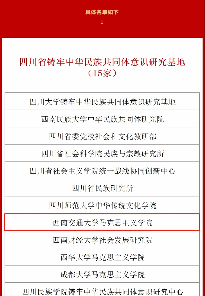 近日,四川省委统战部、省委宣传部、省教育厅、省民族宗教委联合印发《关于命名全省铸牢中华民族共同体意识研究(培育)基地(2023—2025年)的通知》,决定命名全省首批铸牢中华民族共同体意识研究(培育)基地,经过公开申报、联合筛选、实地考察等程序,在学校统战部的领导和帮助下,bevictor伟德官网成功入选。
