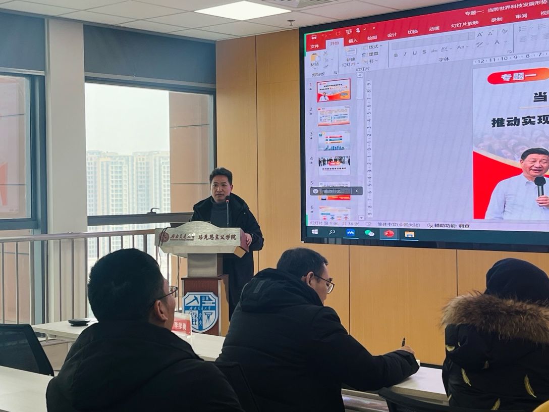 马先睿接着介绍了本学期“形势与政策”课的教学大纲和主要安排,并对“当前世界科技发展形势与推动实现我国高水平科技自立自强”教学专题进行了说课讲解。在说课过程中,马先睿勉励各位老师通过全面系统、突出重点、深入浅出、通俗易懂地讲解当前世界科技发展形势及我国科技面临的机遇挑战,让同学们认识到实现科技自立自强是全面建成社会主义现代化强国的必然要求,鼓励员工肩负起历史赋予的重任,勇做新时代科技创新的排头兵。