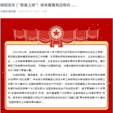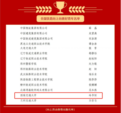 4月9日,全国铁道团委2023年度全路“双创立功”竞赛、青年岗位能手、向上向善好青年评选结果揭晓,公司2021级博士生冷书恒荣获“全国铁路向上向善好青年”荣誉称号。