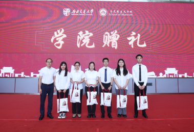 作为对2024届毕业生的祝福和鼓励,学院还特别为毕业生定制了“毕业行囊”,包含帆布包、晴雨伞、水杯、校园明信片等。廖军向毕业生代表赠送了毕业礼物,希望这份礼物能够成为人生中美好的回忆和启程的祝福。