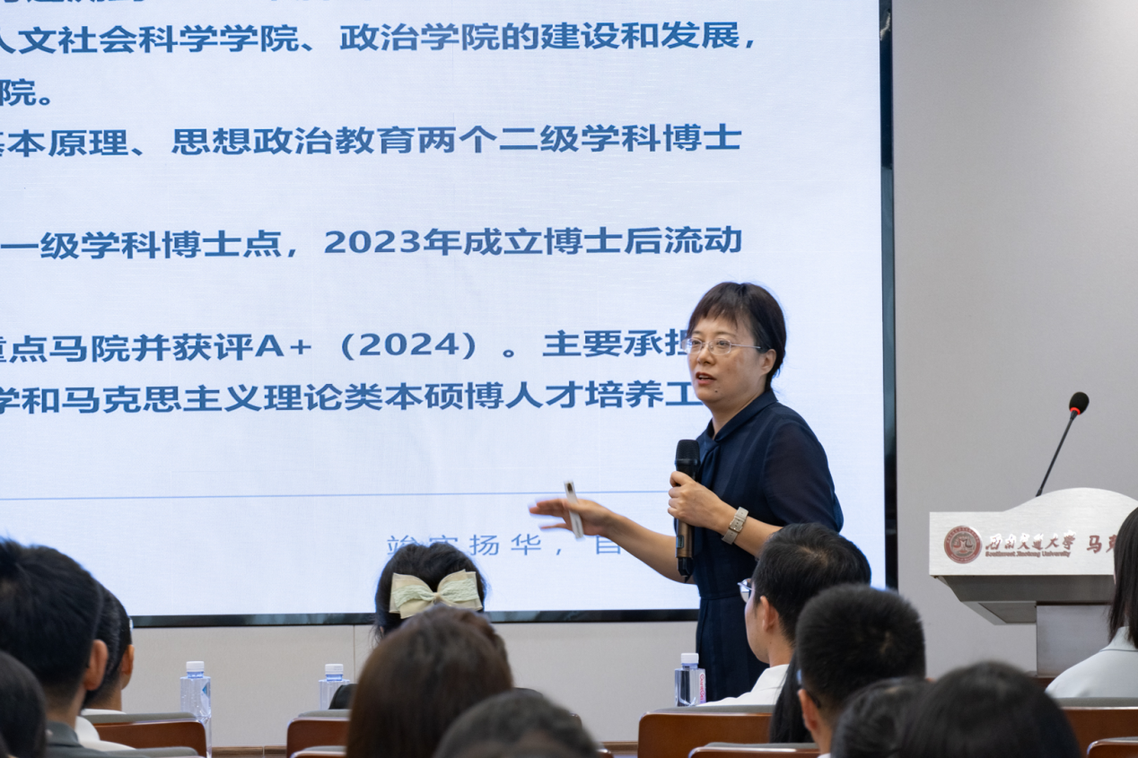 见面会上,学院执行经理田永秀教授分别向本研新生介绍了学院院情,重点介绍了学院在人才培养、教学科研、平台建设、理论宣传等方面的成就和特色亮点,并对全体新生提出了殷切期望。
