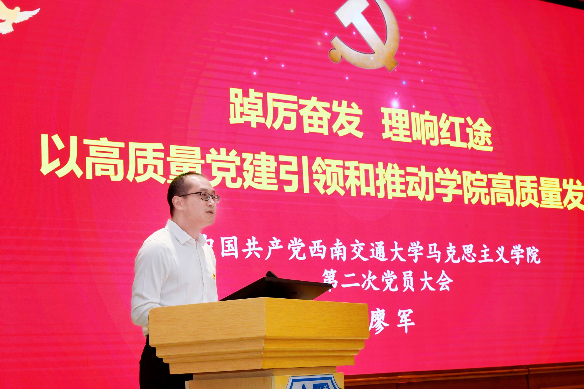 廖军同志代表公司党委作上届工作报告。报告以“踔厉奋发 理响红途 以高质量党建引领和推动学院高质量发展”为题,总结并回顾了第一次党员大会以来开展的工作和成绩,分析了学院当前面临的形势与挑战,并提出了未来五年的工作目标、任务规划与展望,同时号召学院全体师生勇担使命、勇毅前行,全力建设新时代高水平的bevictor伟德官网,为回答好“交通强国、交大何为”的时代课题和实现强国建设、民族复兴的伟大事业贡献马院力量!