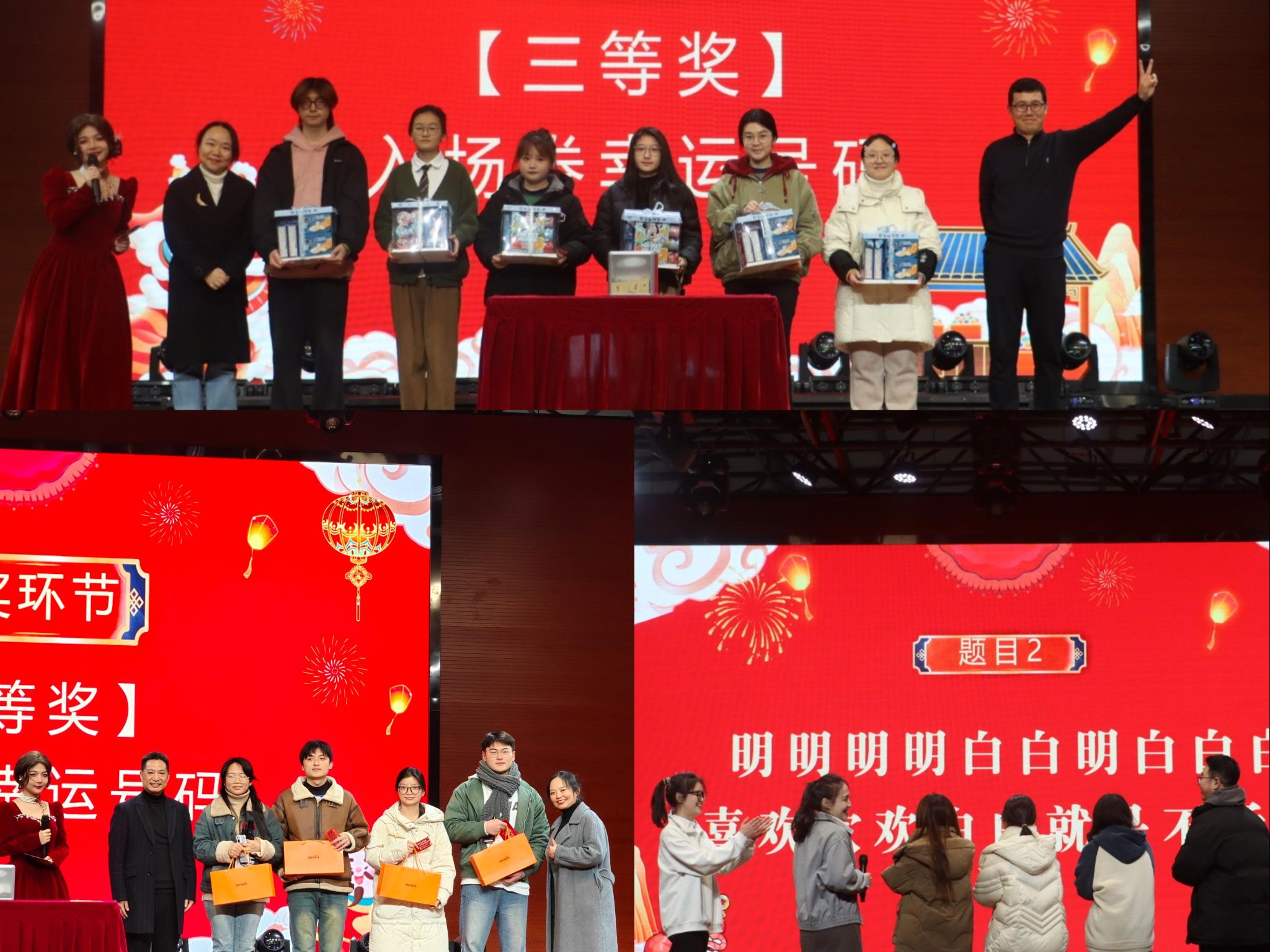 晚会节目与游戏互动穿插进行,师生们积极参与,气氛热烈非凡。现场设置了“绕口令速通”趣味游戏,不仅考验了大家的反应能力和友谊精神,也让师生们在轻松愉快的氛围中增进了感情。在抽奖环节,学院领导亲自上台抽取幸运观众并送上丰富奖品,现场惊喜不断。