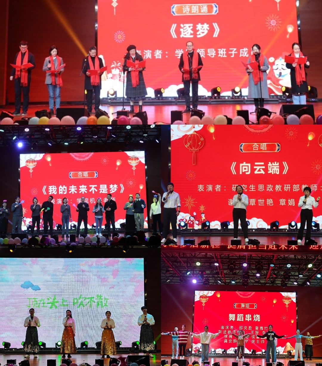 随着热烈的掌声,晚会在璀璨的灯光下拉开帷幕,一曲热情洋溢的开场舞以动感的节奏和流畅的舞步瞬间吸引了全场目光,绚丽的灯光效果与舞者们的激情演绎相得益彰,为晚会奠定了热烈而充满活力的基调,成功点燃了现场氛围。诗词翩翩,歌声朗朗,精彩纷呈的节目轮番上演,充分展现了马克思主义公司师生朝气蓬勃和奋发有为的精神面貌。由学院领导班子成员共同带来的诗朗诵《逐梦》,蕴含着学院对同学们的殷殷期望,激励全院同学不断向着梦想进发,不断再创佳绩。公司师生配合默契,或翩翩起舞,或低吟浅唱,晚会现场高潮迭起,就像一首欢快的交响曲,奏响了新年的序章。