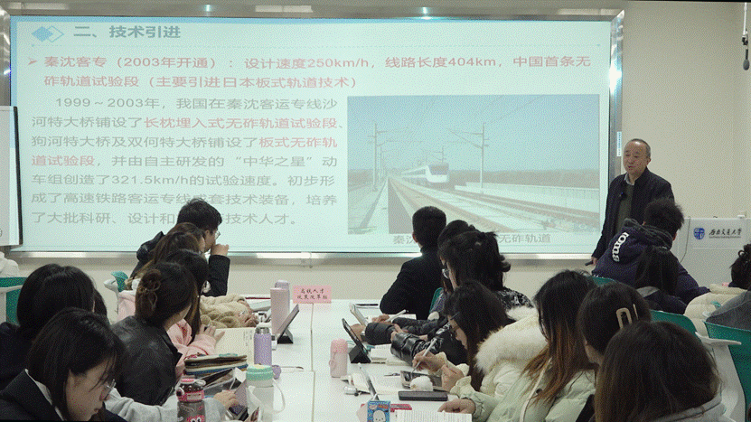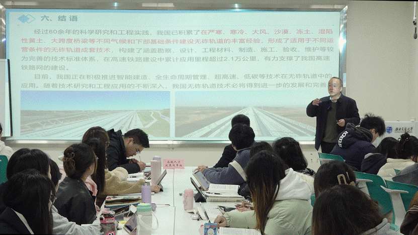 第二板块由朱颖大师主讲。作为中国高铁无砟轨道技术自主创新的亲历者、领军人物,他以“中国高速铁路无砟轨道创新之路”为主线,从技术引进、消化吸收到自主创新的全过程展开讲述。通过展示秦沈客专试验段、遂渝线综合试验段等里程碑工程,朱颖生动还原了CRTS Ⅲ型板式轨道从“跟跑”到“领跑”的突破历程。从依赖国外技术到全球输出“中国标准”,正是教育培养人才、人才推动科技、科技兴旺产业的生动实践。