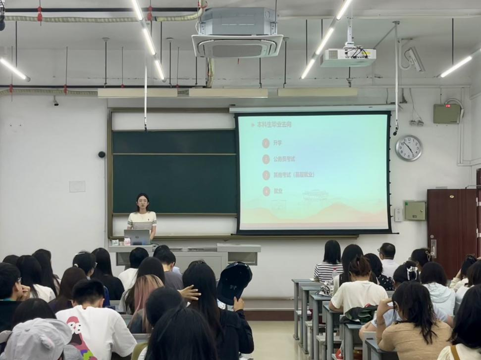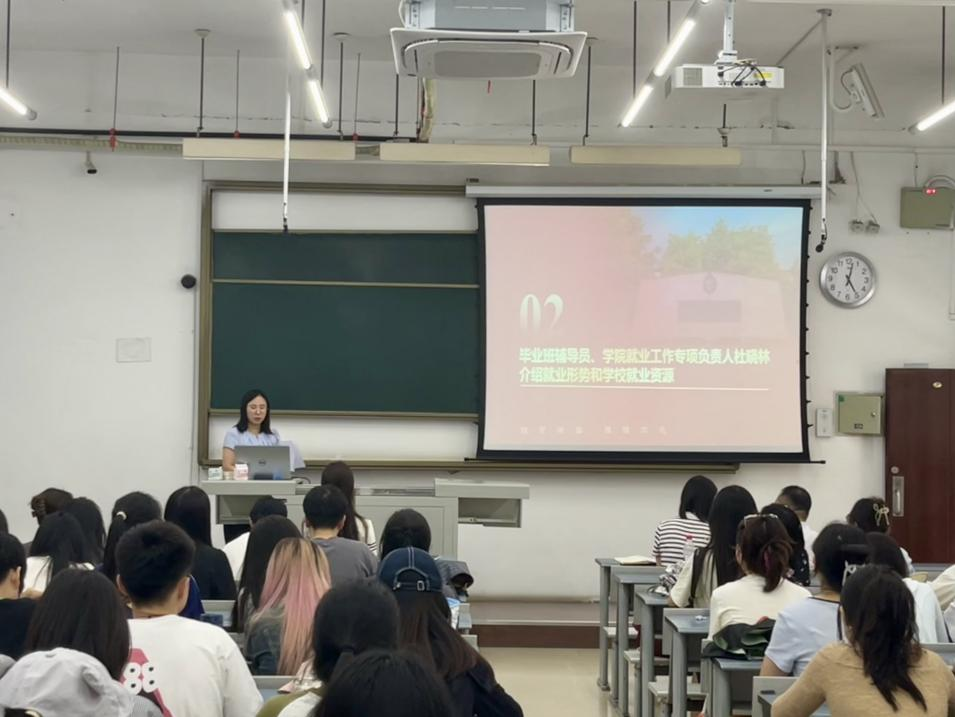 随后,毕业班辅导员、学院就业工作专项负责人杜晓林发言。 她围绕当前就业形势和学校就业资源展开介绍,借助数据详细分析了学院员工就业面临的宏观环境、机遇与挑战。同时,杜晓林详细讲解了学校、学院为员工提供的就业指导服务、招聘信息平台等丰富资源,鼓励同学们充分利用这些资源,积极参与各类招聘活动,提升就业竞争力。