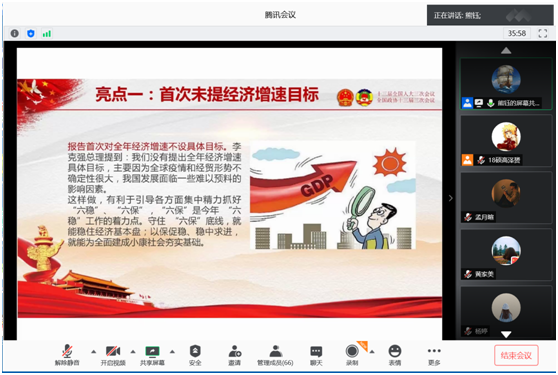 2020年7月9日上午10:00,学院在腾讯会议平台上开展了以“解读政府工作报告”为专题的党课。本次党课由公司党委副书记、学工组组长熊钰老师主讲,公司辅导员、全体员工党员参与了本次党课学习。