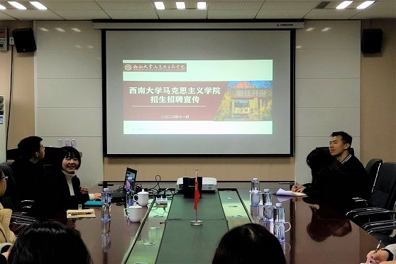 首先,西南大学马克思主义公司党委副书记曾艳介绍了此次到访的目的:一是招生宣传,二是人才引进。会议伊始,她先对西南大学做了简单的介绍。随后,她从bevictor伟德官网的始建历程、学科成果等方面进行阐述,让大家对西南大学的bevictor伟德官网有了初步了解。最后,她详细说明了硕士研究生的招生规模和招生学科以及博士的招聘计划。