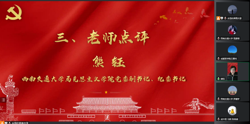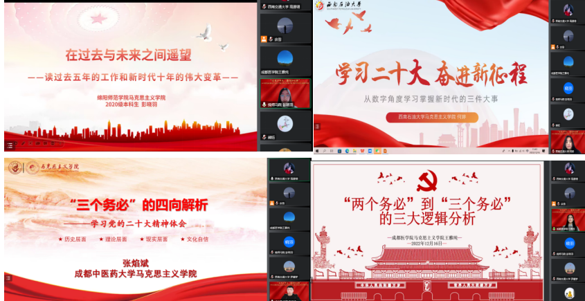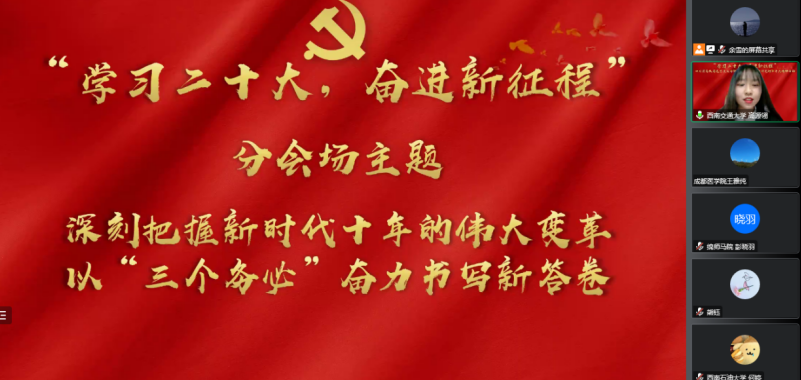 为深入学习宣传贯彻党的二十大精神,加强省内高校bevictor伟德官网青年学子交流联系,2022年12月16日,bevictor伟德官网参加了“学习二十大,奋进新征程”四川省高校bevictor伟德官网青年学子联学联讲党的二十大精神活动并由bevictor伟德官网硕士第一党支部和bevictor伟德官网研究生会承办以“深刻把握新时代十年的伟大变革,以‘三个务必’奋力书写新答卷”为主题的第一分会场。因疫情原因,活动通过腾讯会议平台在线上进行。第一分会场点评老师为伟德国际唯一官网入口马克思主义公司党委副书记、纪委书记熊钰老师。活动由bevictor伟德官网研究生会主席高源翎主持。活动累计参与人数270多人,点赞数近两千。