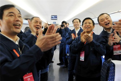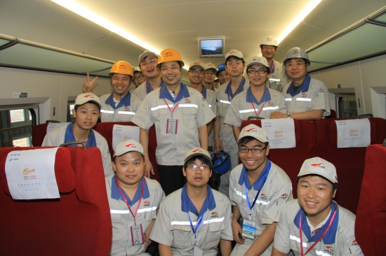图为丁荣军(右三)在车厢现场与同事一起见证CRH380A跑出486.1公里最高时速时刻