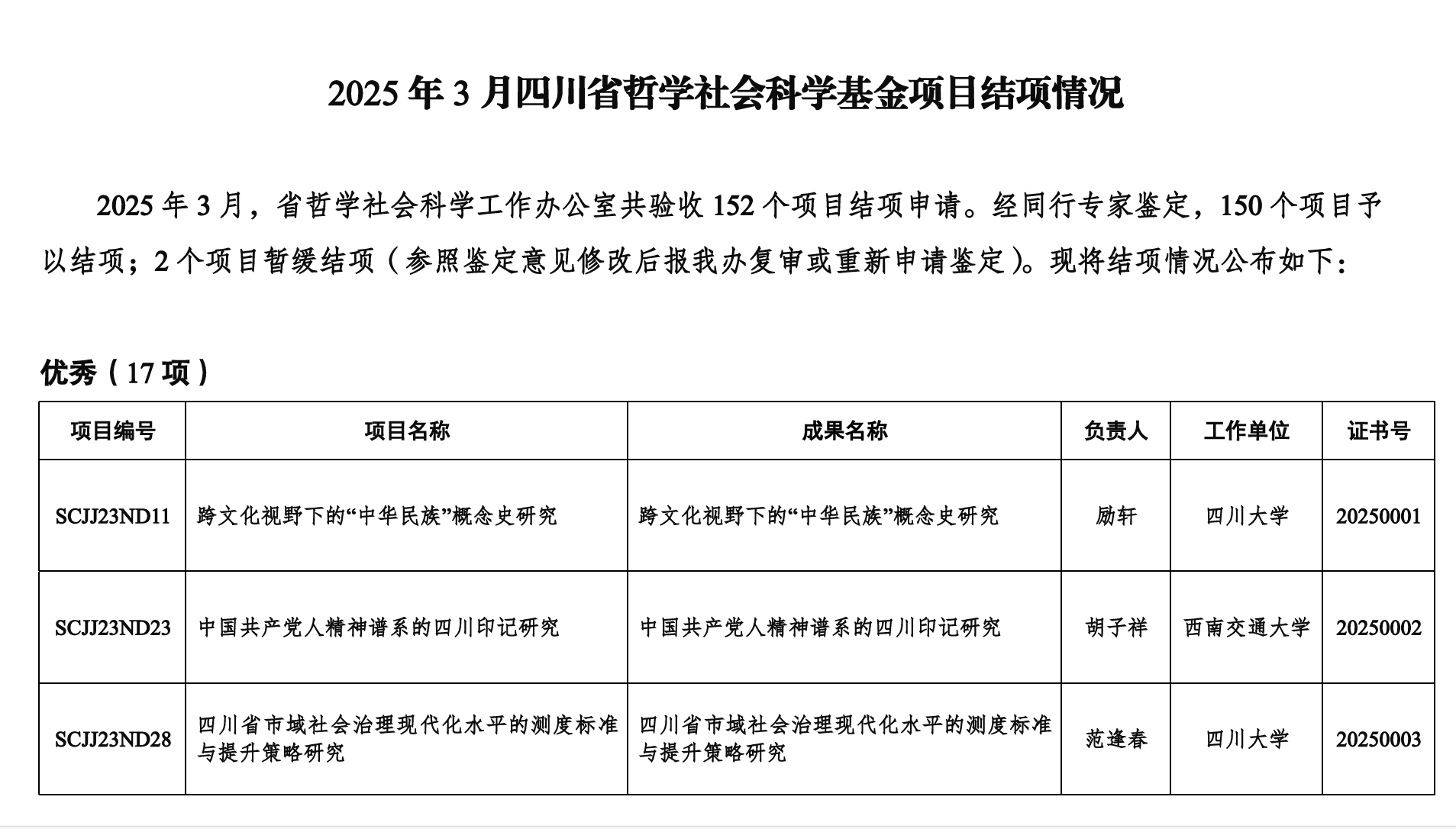 2025年3月18日四川省社会科学界联合会公布四川省哲学社会科学基金项目结项情况,我中心胡子祥教授主持的四川省哲学社会科学基金重点项目“中国共产党人精神谱系的四川印记研究”(项目编号:SCJJ23ND23)获评“优秀”,通过结题鉴定。